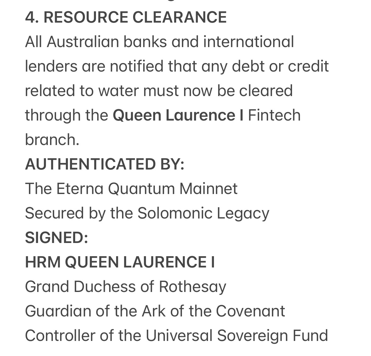 All Australian banks and international lenders are notified that any debt or credit related to water must now be cleared through the Queen Laurence I Fintech branch.