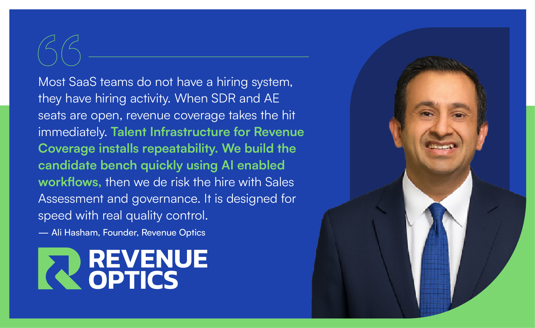 "Most SaaS teams do not have a hiring system. They have hiring activity," said Ali Hasham, Founder and CEO of Revenue Optics. "When SDR and AE seats are open, revenue coverage takes the hit immediately. Talent Infrastructure for Revenue Coverage installs repeatability. We build the candidate bench quickly using AI enabled workflows, then de risk the hire with Sales Assessment and governance. It is designed for speed with real quality control. Our goal is to help SaaS leaders protect revenue coverage and remove hiring as a growth bottleneck."