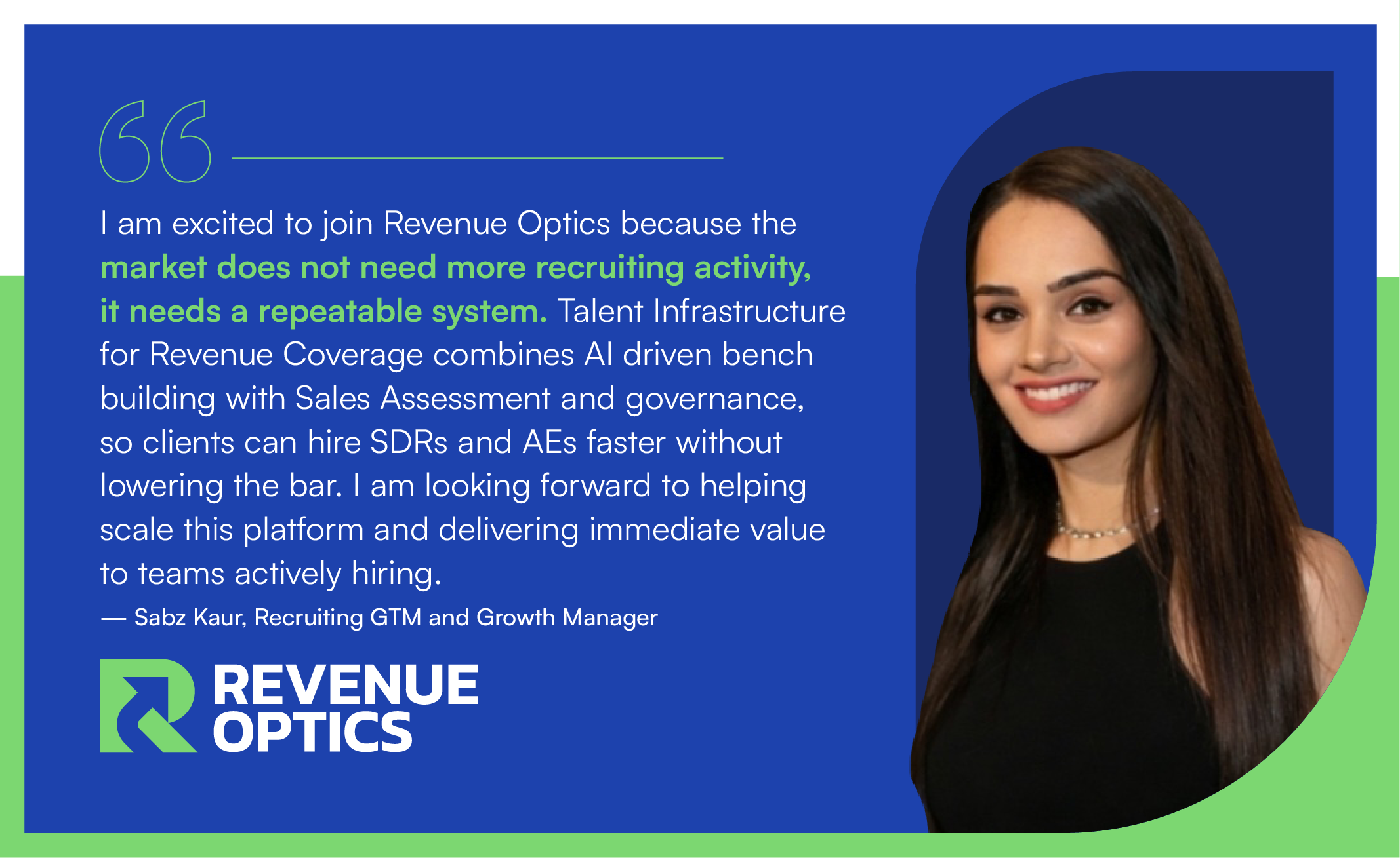"I am excited to join Revenue Optics because the market does not need more recruiting activity. It needs a repeatable system," said Sabz Kaur, Recruiting GTM and Growth Manager. "Talent Infrastructure for Revenue Coverage combines AI driven bench building with Sales Assessment and governance so clients can hire SDRs and AEs faster without lowering the bar. I am looking forward to helping scale this platform and delivering immediate value to teams actively hiring."